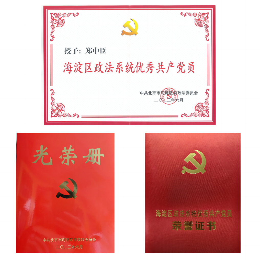 郑中臣主任表示:很荣幸获得“海淀区政法系统优秀党员”称号,今后将更加严于律己,以身作则,发挥党员先锋模范带头作用,继续听党话,跟党走。