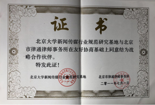 北京市律通律师事务所与北京大学新闻传媒行业规范研究基地达成战略合作伙伴。2011年7月1日,北京市律通律师事务所与北京大学新闻传媒行业规范研究基地达成战略合作伙伴关系。 双方将进一步加强新闻传媒行业的法律规范方面的合作。就新闻传媒行业的法律规范,理论研究、法律实务等问题展开合作。