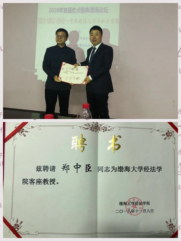 2018年11月8日上午,律通律师事务所郑中臣律师受聘为渤海大学经法学院客座教授仪式在渤海大学经法学院举行。渤海大学经法学院院长张满林教授为郑中臣律师颁发聘书。