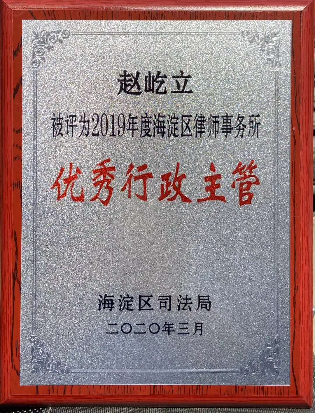 赵屹立被评为2019年度海淀区律师事务所优秀主管