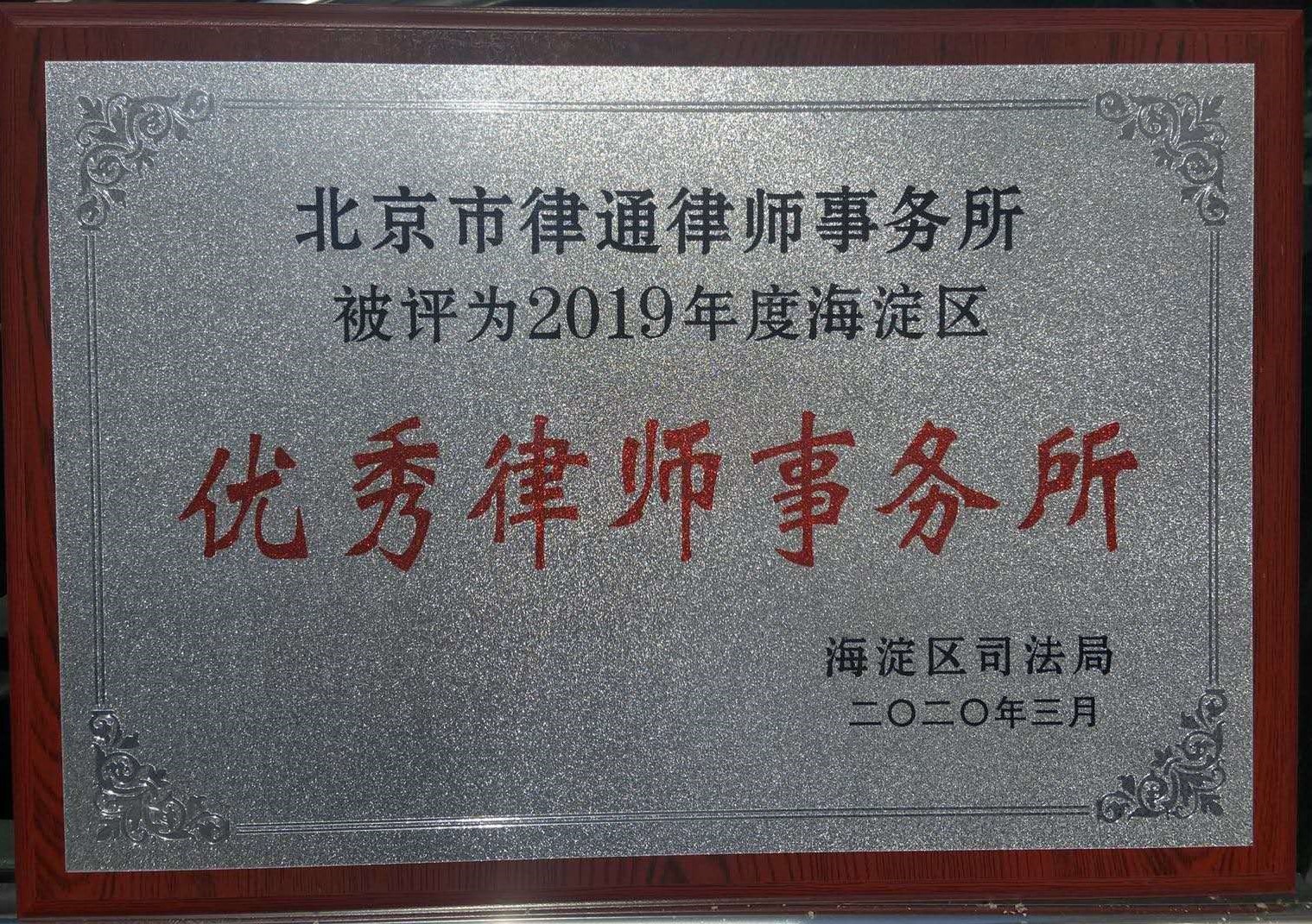 北京市律通律师事务所被北京市海淀区司法局评为2019年度优秀律师事务所