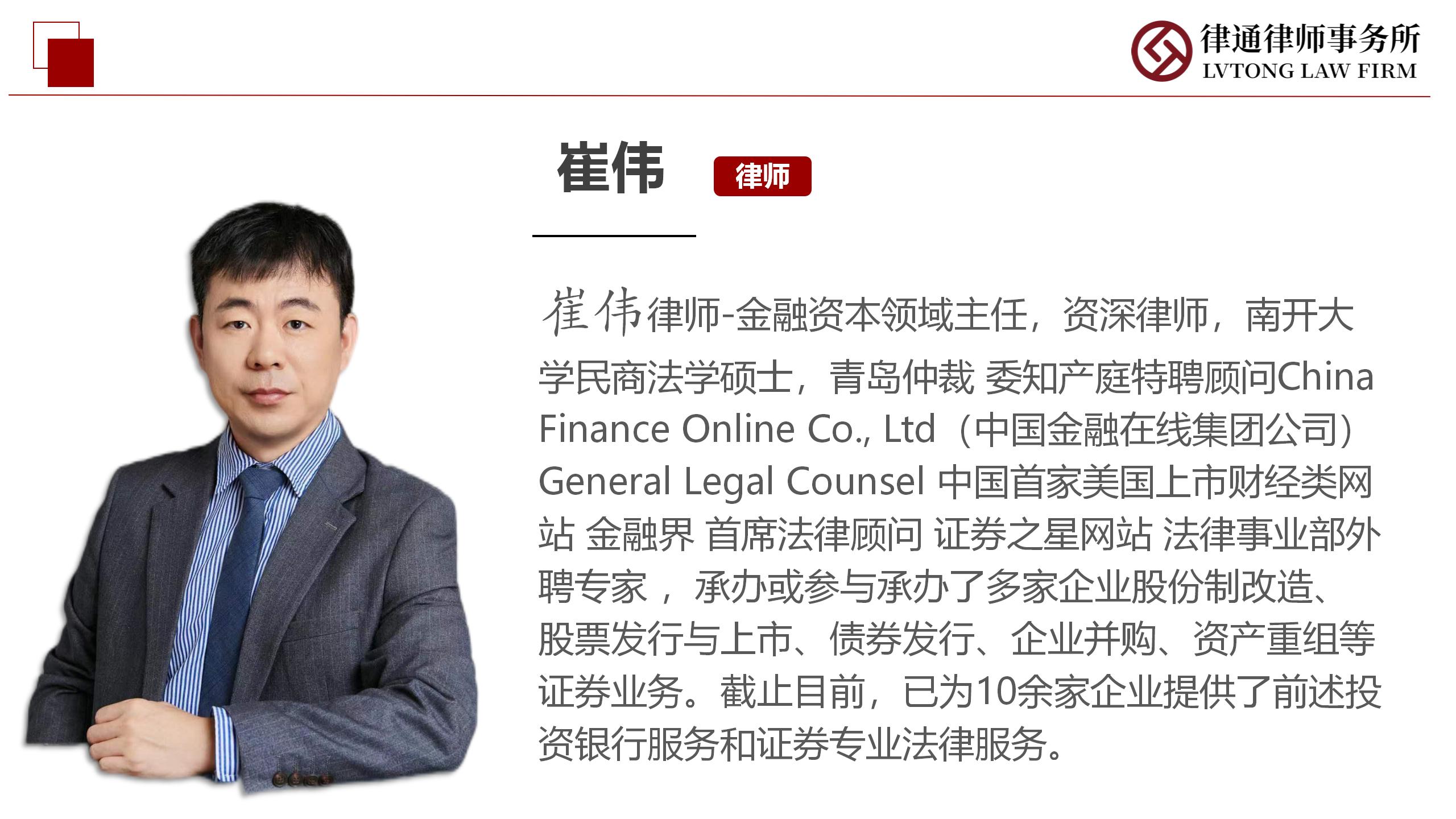 崔伟律师,南开大学民商法学硕士,青岛仲裁 委知产庭特聘顾问China Finance Online Co., Ltd(中国金融在线集团公司)General Legal Counsel 中国首家美国上市财经类网站 金融界 首席法律顾问 证券之星网站 法律事业部外聘专家 ,承办或参与承办了多家企业股份制改造、股票发行与上市、债券发行、企业并购、资产重组等证券业务。截止目前,已为10余家企业提供了前述投资银行服务和证券专业法律服务。