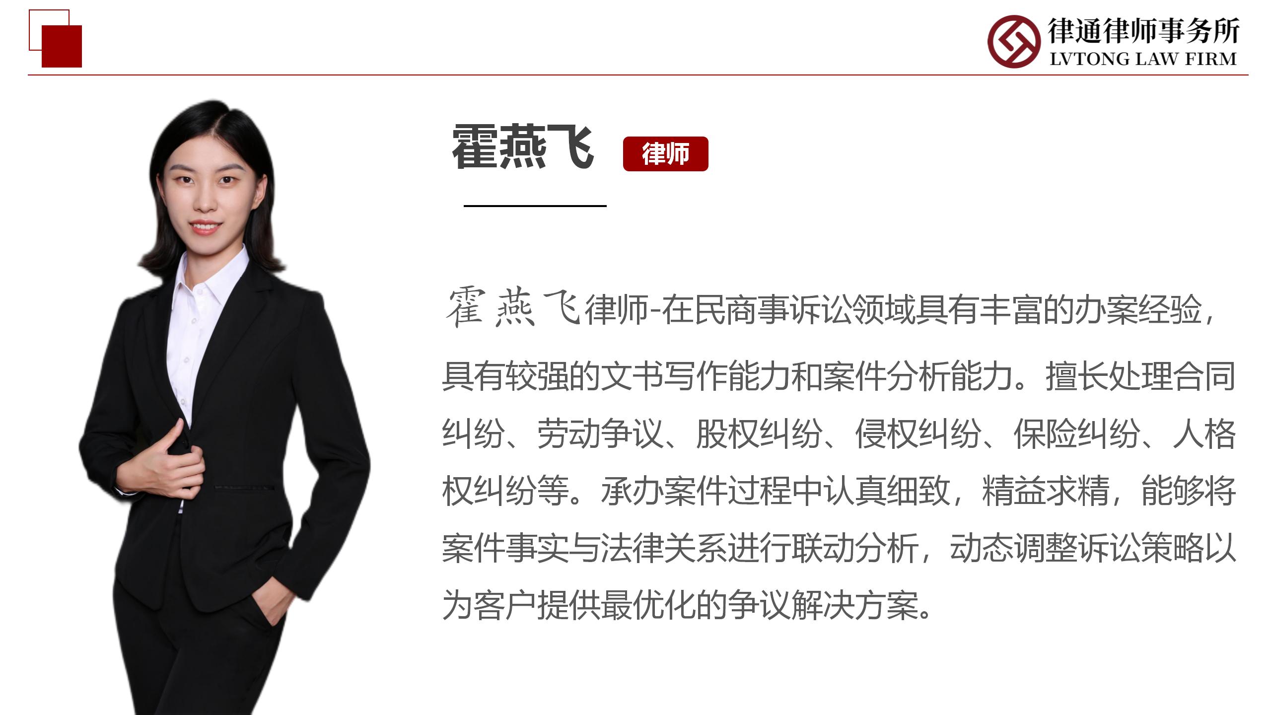 霍燕飞律师,在民商事诉讼领域具有丰富的办案经验,具有较强的文书写作能力和案件分析能力。擅长处理合同纠纷、劳动争议、股权纠纷、侵权纠纷、保险纠纷、人格权纠纷等。承办案件过程中认真细致,精益求精,能够将案件事实与法律关系进行联动分析,动态调整诉讼策略以为客户提供最优化的争议解决方案。
