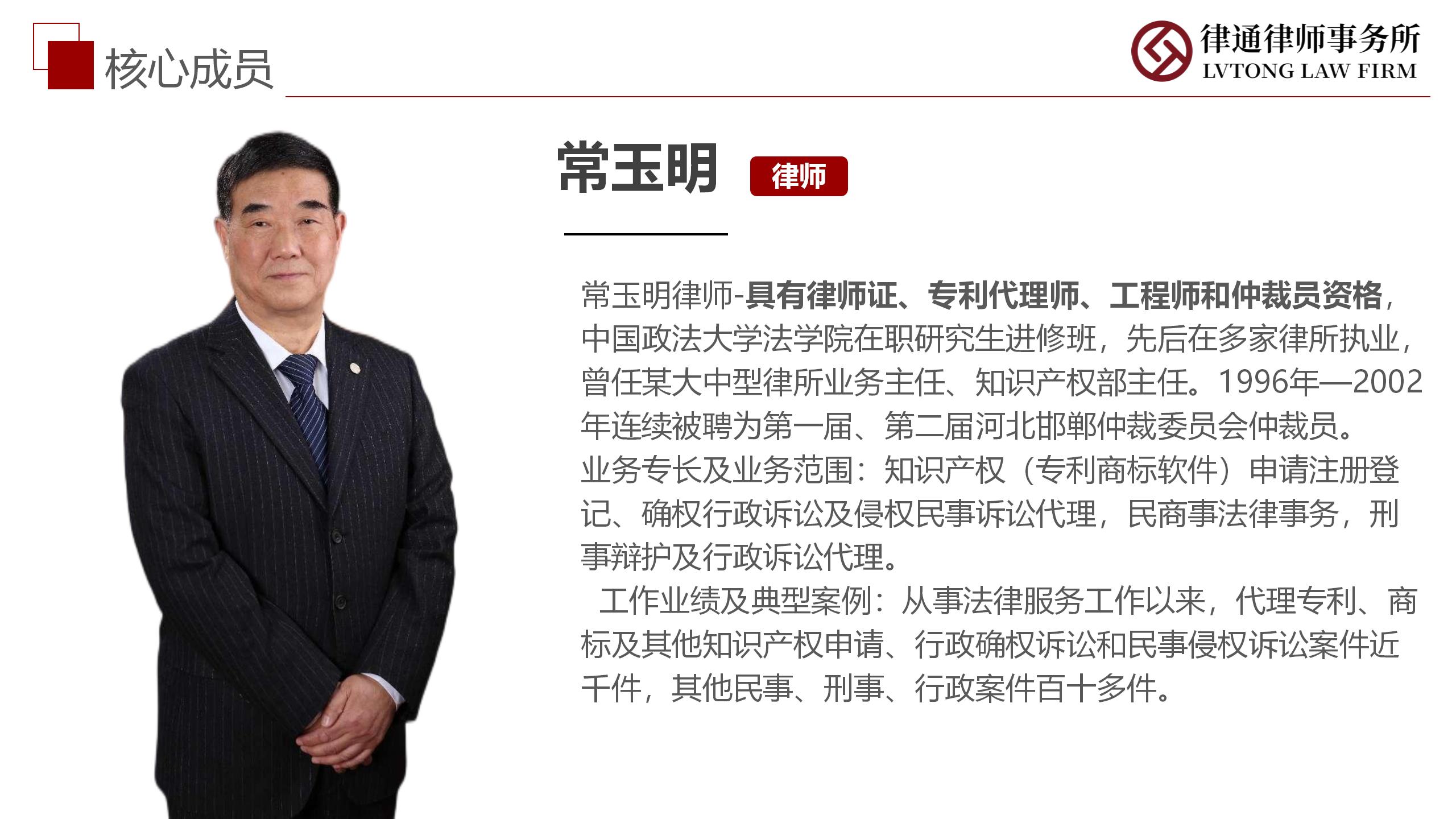 常玉明律师,中国政法大学法学院在职研究生进修班,先后在多家律所执业,曾任某大中型律所业务主任、知识产权部主任。1996年—2002年连续被聘为第一届、第二届河北邯郸仲裁委员会仲裁员。