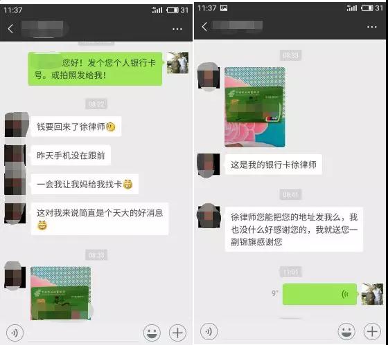通过微信聊天记录,我们能够感受到受援人李想的开心,也能理解他的不易。李想在微信中写道:“徐律师您能把您的地址发给我吗,我也没什么好感谢您的,我就送您一副锦旗感谢您。”徐华律师说:“你的心意我收下了,但是锦旗就不用了,能帮助你拿回这笔钱我也很开心……”