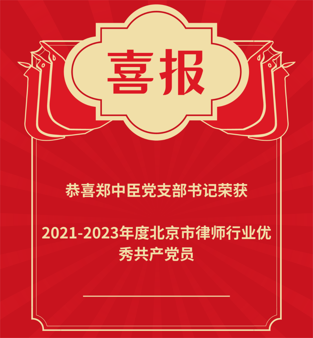 近日,北京市律师协会公布了一批荣获“2021-2023年度北京市律师行业优秀共产党员”称号的人员,其中,我所郑中臣主任荣获此殊荣。传承中国律师红色基因,做行业清风正气的守护者,恪守律师职业道德和执业纪律,带头信仰法治、敬畏法治、捍卫法治,切实维护律师行业的声誉和形象,维护法律权威,促进公平正义。